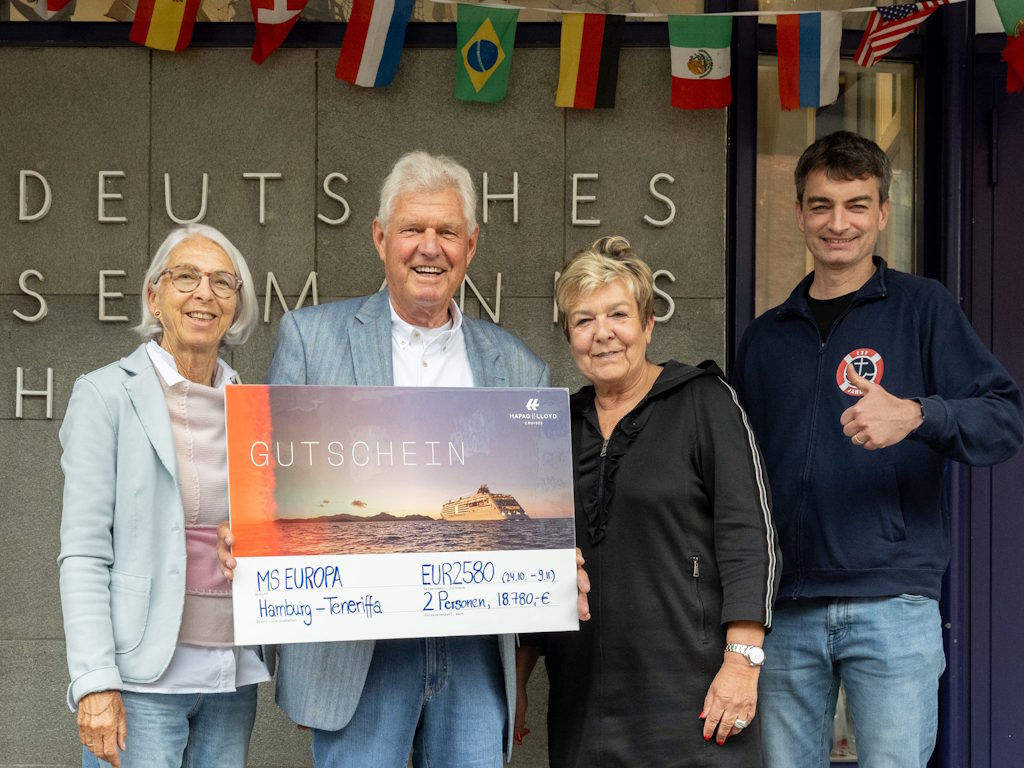 Übergabe des Hauptgewinns vom Maritimen Adventskalender 2024: v.l. Birgt und Reinar Petersen, Isolde Susset, Felix Tolle